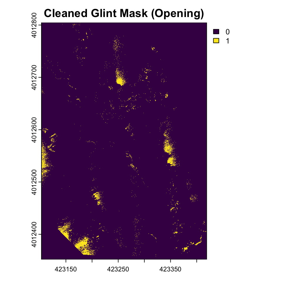 plot(glint_opened, main="Cleaned Glint Mask (Opening)")