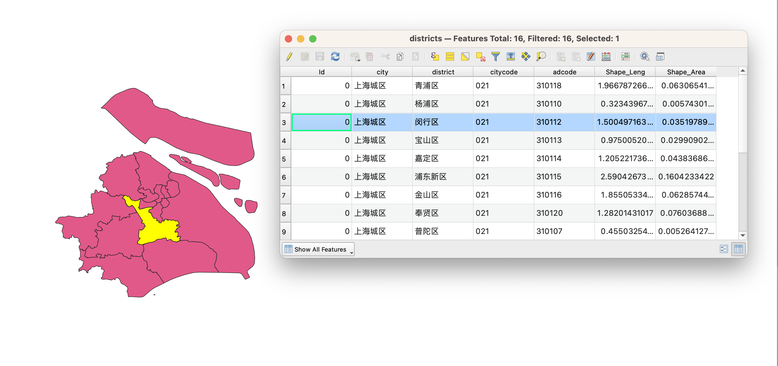| 0 | 上海城区 | 青浦区 | 021 | 310118 | 1.9667873 | 0.0630654 | MULTIPOLYGON (((121.0643 31... |