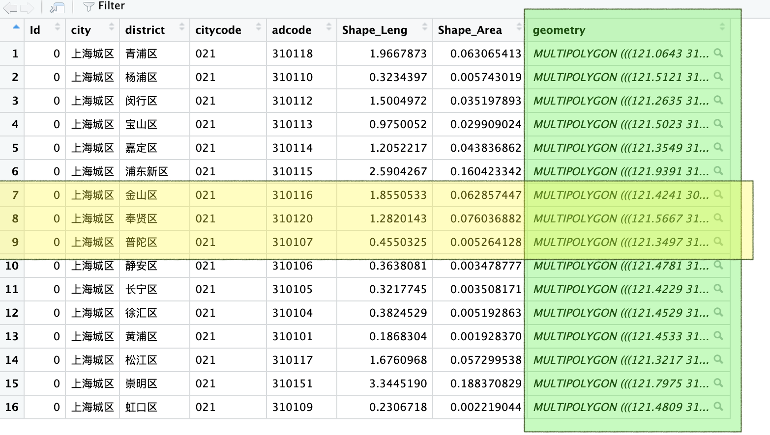 | Id | city | district | citycode | adcode | Shape_Leng | Shape_Area | geometry |